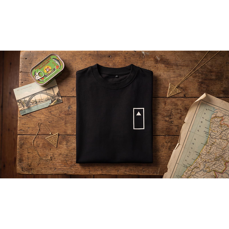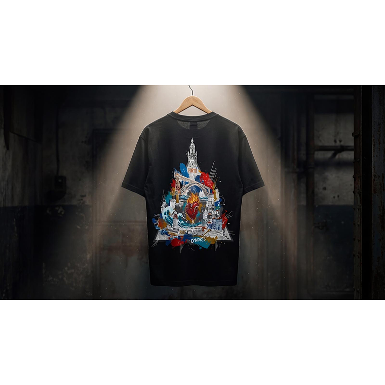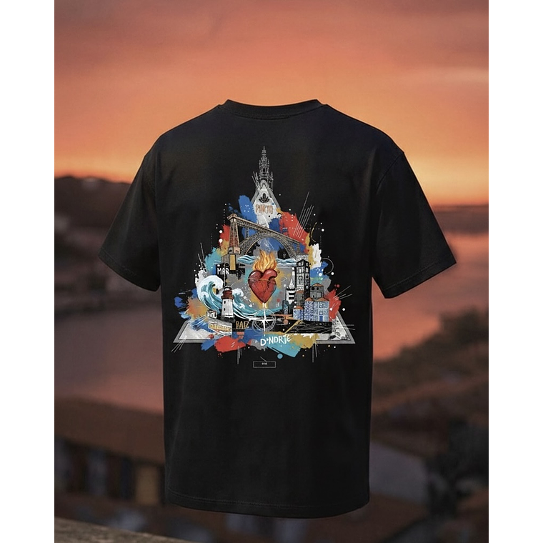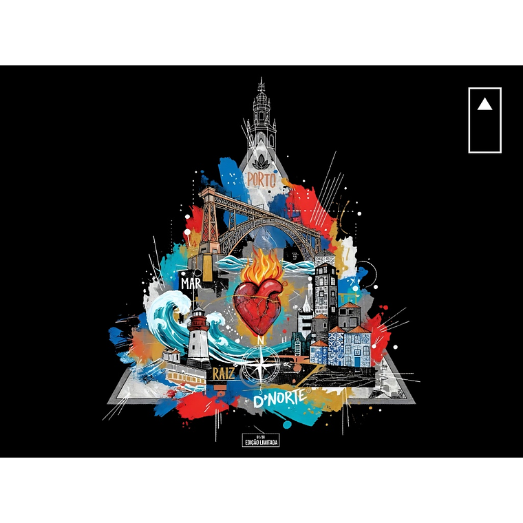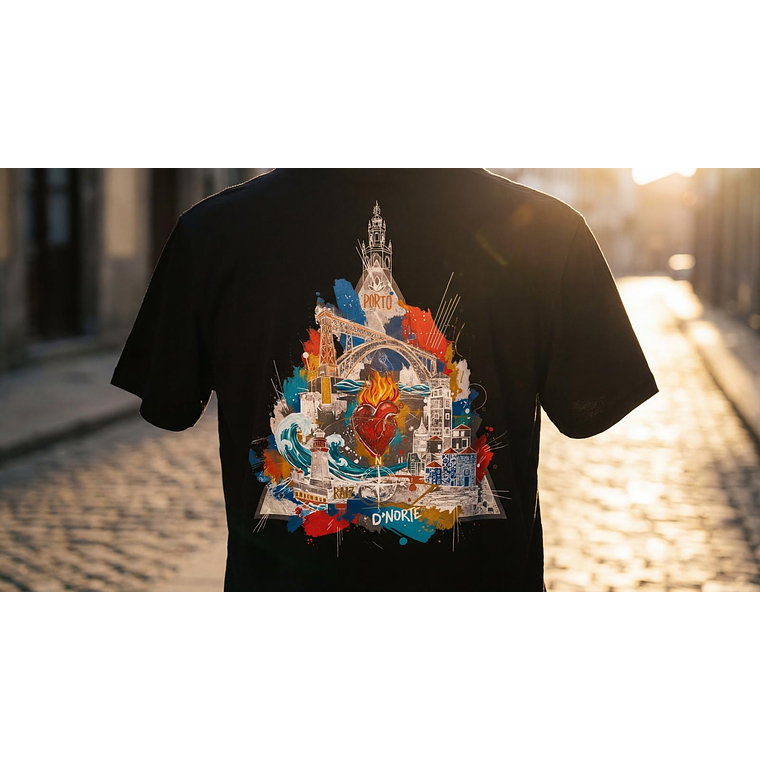 A Arte (Costas): As costas são a tela principal, exibindo uma ilustração original e exclusiva D'NORTE, complexa e vibrante, que funde os ícones da Invicta. Desde a silhueta inconfundível da Torre dos Clérigos à estrutura imponente da Ponte D. Luís, o design capta a alma da cidade. A arte flui até ao "MAR", com o farol a guiar, e mergulha na "RAIZ" com um coração ardente, simbolizando a paixão e a força do Norte.
